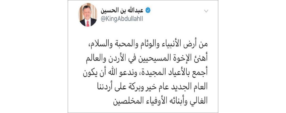 الملك: من أرض الأنبياء والوئام والمحبة والسلام أهنئ الأخوة المسيحيين في الأردن والعالم بالأعياد المجيدة