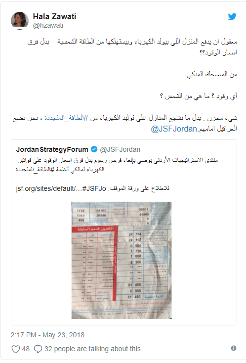وغردت الزواتي قبل دخولها الدوار الرابع باسبوع "ان يدفع المستهلك -الذي لديه نظام لتوليد الكهرباء من الشمس - بدل فرق اسعار الوقود وهو لم يستهلك وقود للكهرباء اللي استهلكها هو ما لا يمكن هضمه ابدا وهو ضريبه مخفيه تحت بند فرق اسعار الوقود ويجب الغاءها".