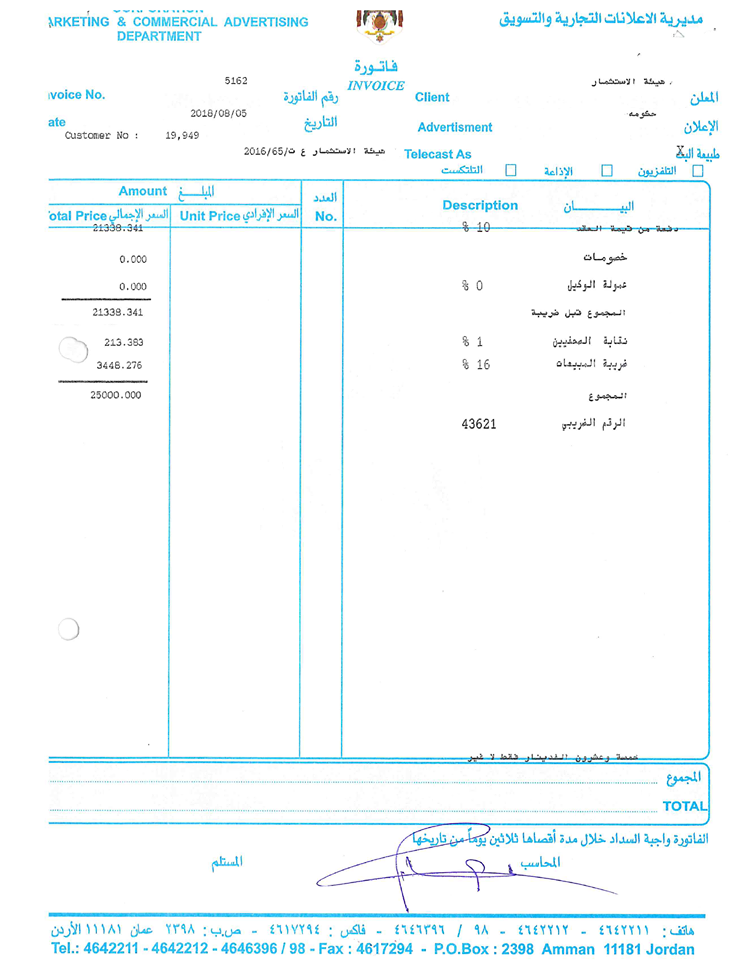 أظهرت مطالبة مالية للتفزيون الأردني تطالب بها هيئة الاستثمار بمبلغ 25 ألف دينار أردني ما نسبته 10% من قيمة العقد المبرم بين الهيئة والتلفزيون مقابل تغطيات اخبارية يقوم بها التلفزيون الاردني لهيئة الاستثمار.وتشير النسبة الى ان قيمة العقد المبرم 250 ألف دينار. وقالت هيئة الاستثمار ان هذه الاتفاقية ابرمت في عام 2016 وتنتهي في منتصف العام القادم، أي خلال 3 اعوام ونصف.واضافت ان الاتفاقية تضمنت الرعاية خلال البرامج الاقتصادية.وأكدت ان قيمة الاتفاقية لا تذكر في عالم الاعلام، الا ان ميزانية الهيئة لا تسمح لها بالاعلان عبر الفضائيات الخارجية لارتفاع قيمة الاعلان، ولذلك لجأت الى التلفزيون الأردني.واشار الى ان أكثر من 70% من نسبة الاستثمار في الأردني محلي.
