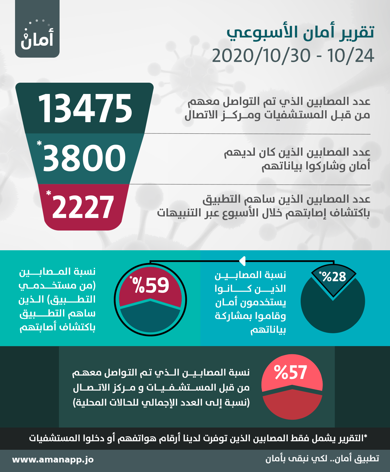ساهم تطبيق أمان، الذي أطلقته وزارة الصحة، بكشف 2227 إصابة مؤكدة بفيروس كورونا المستجد، خلال الأسبوع الماضي بمعدل 318 إصابة مؤكدة يوميا.وقال التطبيق، في منشور له عبر منصة فيسبوك، إن المستشفيات ومراكز الاتصال تواصلت مع 13475 مصابا ما نسبته 57%، كما استخدم 3800 مصاب التطبيق، وشاركوا بياناتهم منذ الـ24 من تشرين الأول.ويرسل تطبيق "أمان" تنبيهات إلى مستخدميه الذين يُشتبه بمخالطتهم مُصابا بالفيروس كان قد حمّل التطبيق على هاتفه. لكنه لا ينبه الأشخاص المخالطين لمصاب لا يُحمّل التطبيق على هاتفه.