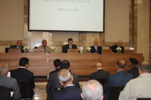 عقدت الهيئة العامة لبنك الاستثمار العربي الاردني AJIB اجتماعها السنوي العادي التاسع والثلاثون اليوم الخميس الموافق 26/4/2018 بحضور رئيس مجلس الادارة هاني القاضي وحضور مندوب مراقب عام الشركات د.ايمن الشرايدة الذي اعلن قانونية الجلسة بحضور 28 من اصل 711 مساهم يحملون بالاصالة 80.768.820 وبالوكالة 51.703.640 ما مجموعه 132.470.966 ما يشكل ما نسبته 88% من رأس المال البنك البالغ 150 مليون دينار .