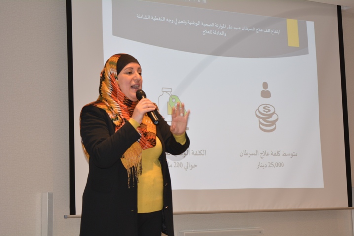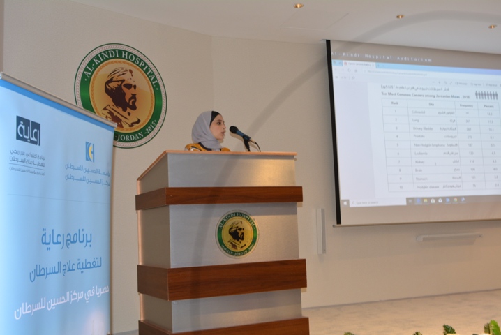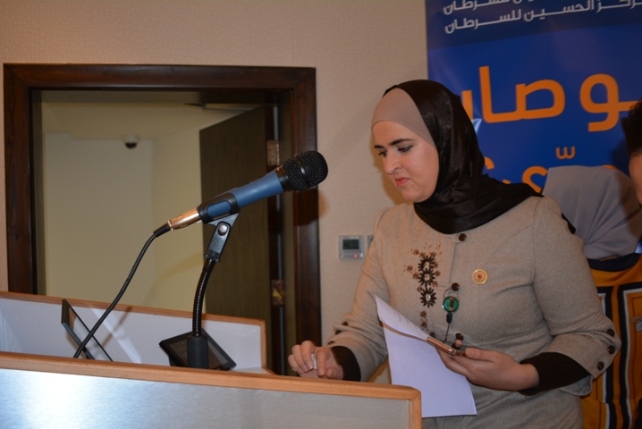 من جهتها أشارت الدكتورة ياسمين عز الدين من مركز الحسين للسرطان إلى الحملة التي أطلقها المركز بعنوان " قد التحدي" وقدمت تعريفاً بمرض السرطان وأنواعه موضحة ان السرطان هو نمو غير طبيعي لخلايا الجسم.