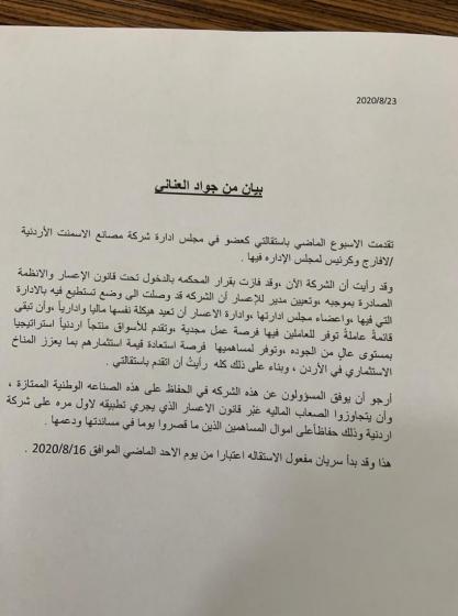 محرر الشؤون المحلية: قدم رئيس مجلس إدارة شركة لافارج، جواد العناني، استقالته من منصبه كرئيس لمجلس إدارة الشركة. وقدم العناني استقالته، كعضو في مجلس إدارة شركة مصانع الإسمنت الأردنية لافارج، وكرئيس لمجلس الإدارة فيها. وقال العناني، في بيان له، إنه رأى فوز الشركة بقرار المحكمة، القاضي بالدخول تحت قانون الإعسار، والأنظمة الصادرة بموجبه، وتعيين مدير للإعسار، أوصلها إلى وضع تستطيع فيه الإدارة أن تعيد هيكلة نفسها ماليا وإدرايا، وأن تبقى قائمة عاملة. الا ان التوقيت جاء ملفتا للمراقبين حيث تأتي هذه الاستقاله في الوقت الذي تجري فيه ترتيبات عمودية في بنيه هيكل المستشارين في القصر الملكي بالإضافة إلى تصاعد المؤشرات التي ترجح إعادة ترتيب اللجنة الاقتصادية القريبة من حكومة الرزاز، كما تزامنت استقالة العناني مع بروز افكار لتيارات من العيار الثقيل تدفع باتجاه خلق التوازن بين الملف الاقتصادي والملف الصحي في أعقاب تصاعد أرقام الإصابات وظهور تيار في جسم الهيكل الحكومي يروج للعودة الى الحجر الشامل. فيما ترجح التقييمات ان عين العناني تتجه نحو البنك المركزي بعد بروز تكهنات حول تغييرات قد تشمل الجسم المصرفي أيضا.، ويذكر أن جواد العناني كان قد طرح قبل عدة اسابيع فكرة العودة إلى الكونفدراليا ضمن سياق الحديث عن حل الدولة الواحدة التي تكلم بها الرزاز الى صحيفة الغارديان، اذا ثمة مشروع سياسي اندمج مع العقلية الاقتصادية للدكتور جواد العناني تزامنت مع تغيرات يتم الاعداد لها على نار هادئة فهل جاءت الاستقالة بناء على غمز ولمز نحو التنصيب عموديا للعناني ام حالة هدوء يركن لها العناني في ظل اعسار لافارج؟
