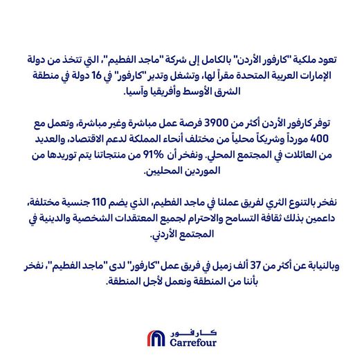 وقال بيان كارفور الأردن ، ان ملكية كارفور الأردن تعود بالكامل لشركة ماجد الفطيم الإماراتية ، والتي تدير فروع كارفور في 16 دولة في الشرق الأوسط وافريقيا واسيا.