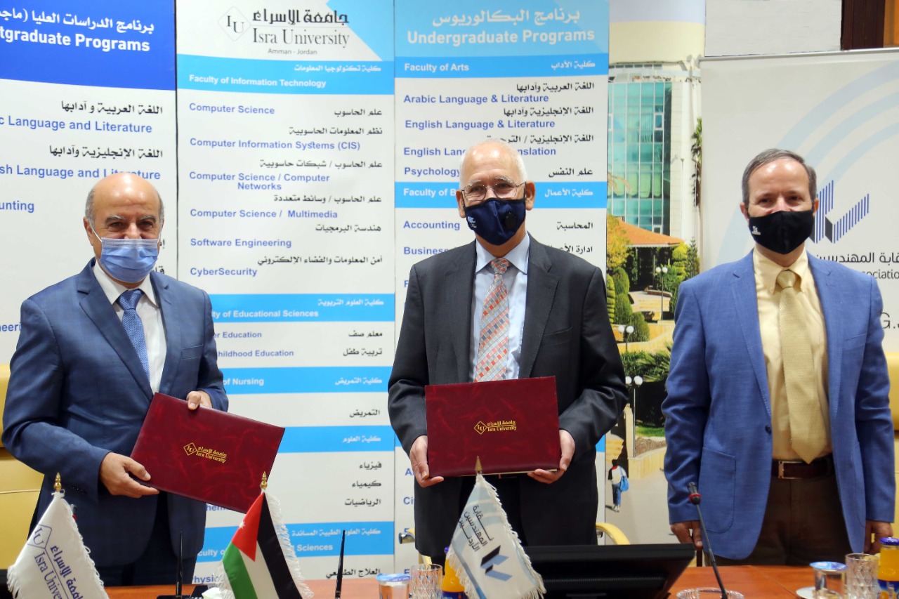:وقعت نقابة المهندسين الأردنيين، وجامعة الإسراء، مذكرة تفاهم لتكريس الشراكة ومد جسور التعاون بين الطرفين في مجالات التدريب بين الجامعة والنقابة، وذلك لعقد دورات وبرامج تدريبية مختلفة للمهندسين.