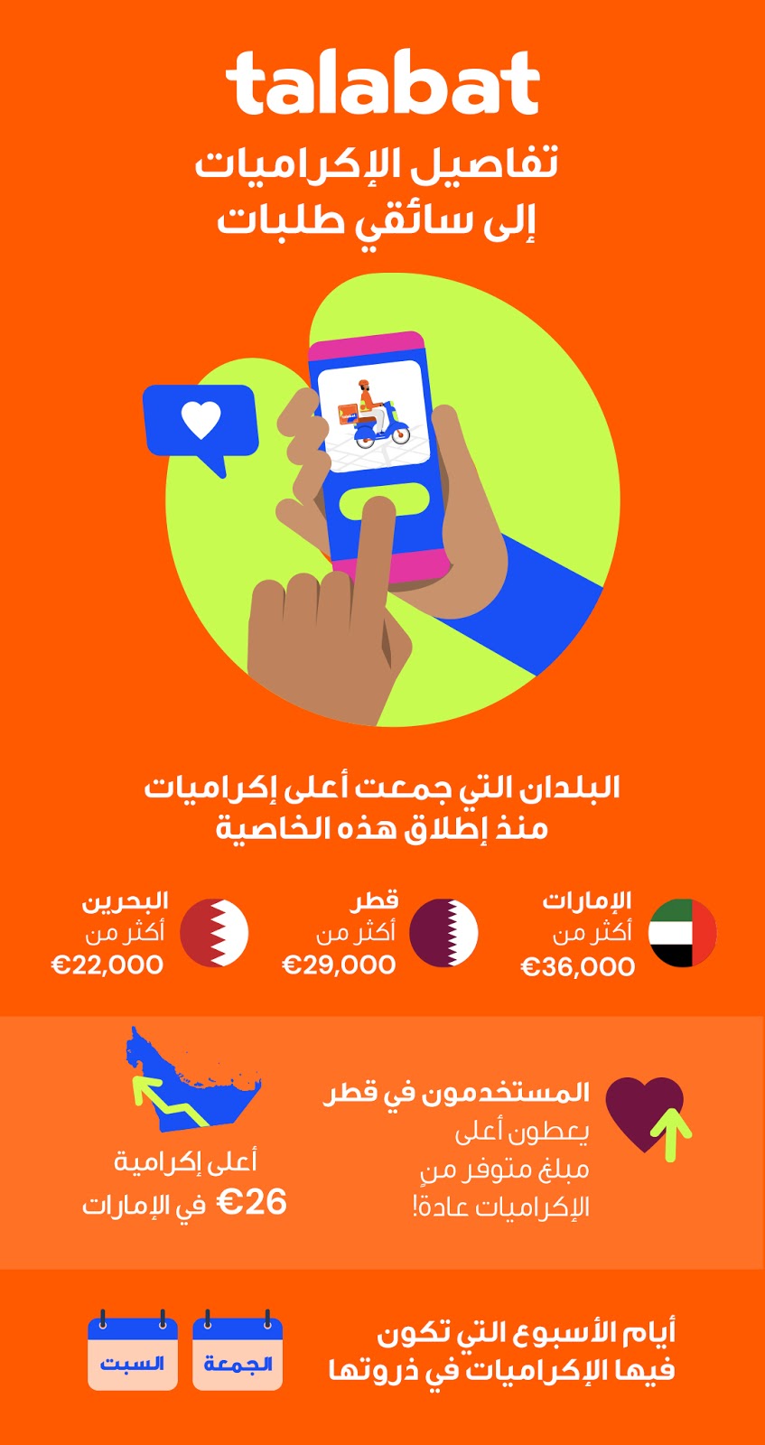 هذا ومنذ إطلاق هذه الخاصية العام الماضي، قدّم المستخدمون ما يزيد عن 100 ألف يورو إكرامًا لجهود السائقين وتضحياتهم في أوقات الحجر المنزلي. وفي فبراير 2021، حصل سائقو «طلبات» إقليميًّا على إكراميات قرابة 10 آلاف يورو، وهذا هو أعلى رقم هذا العام.