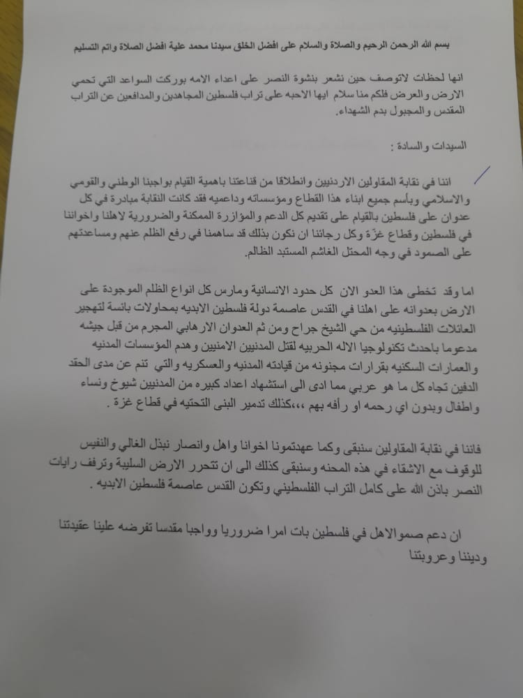 فيما يلي بيان نقابة المقاولين الاردنيين