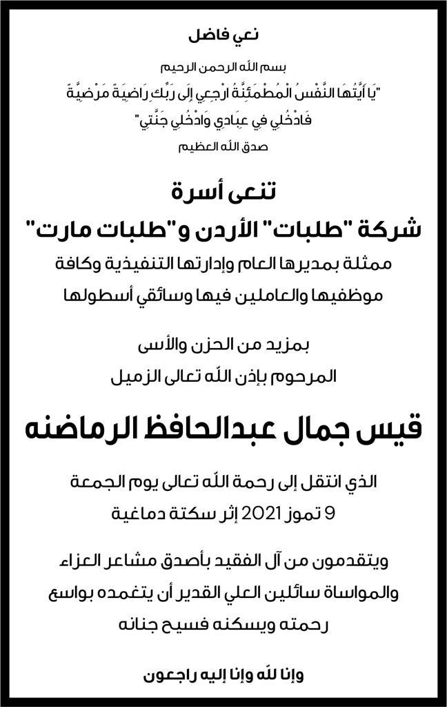 صدق الله العظيم - تنعى أسرة شركة "طلبات" الأردن و"طلبات مارت" ممثلة بمديرها العام وإدارتها التنفيذية وكافة موظفيها والعاملين فيها وسائقي أسطولها بمزيد من الحزن والأسى المرحوم بإذن الله تعالى الزميل قيس جمال عبدالحافظ الرماضنة، الذي انتقل إلى رحمة الله تعالى الجمعة اثر سكتة دماغية.ويتقدمون من آل الفقيد بأصدق مشاعر العزاء والمواساة سائلين العلي القدير أن يتغمده بواسع رحمته ويسكنه فسيح جنانه.وإنا لله وإنا إليه راجعون