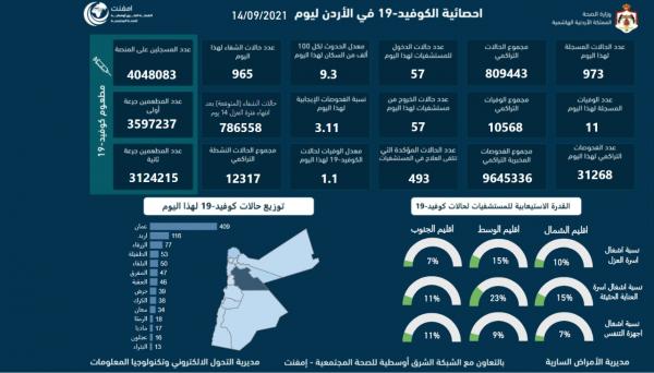 تسجيل 11 وفاة و973 إصابة جديدة بكورونا أنباء الوطن - أعلنت وزارة الصحة اليوم الثلاثاء، عن تسجيل 11 وفيات و 973 اصابة كورونا جديدة في الأردن.