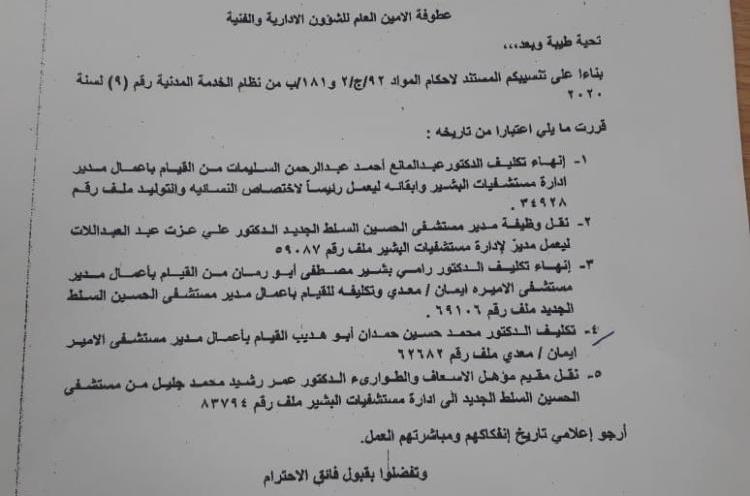 و أجرى وزير الصحة الدكتور فراس الهواري تنقلات على صعيد الإدارات في عدد من مستشفيات وزارة الصحة حسب ما توضحه الوثيقة التالية