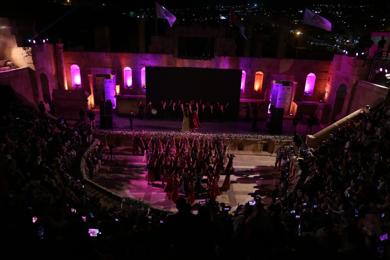 وجاءت اللوحات الفنية الاستعراضية التي انطلقت من بين الجمهور، ومن خلال مواطن جرشي بلباسه التاريخي، لتعلن ارتباط الجمهور بهذا العمل الفني، حيث تبدأ اللوحات الراقصة التي تؤكد ارتباط الماضي بالحاضر لاهل المكان وسط استعراض فني ادائي راقص يعيد تشكلات الحياة عبر الزمن في هذه المدينة الغارقة في الزمن.