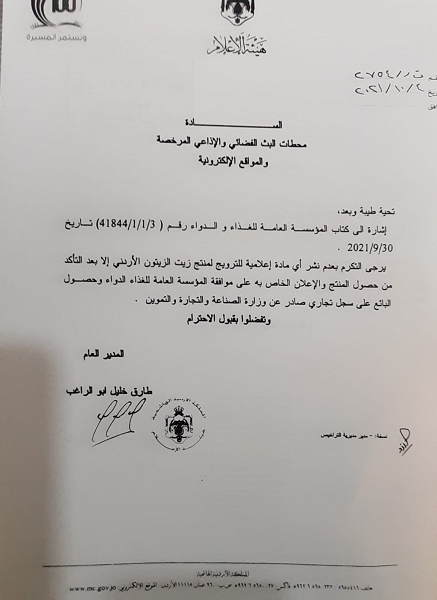 أنباء الوطن - :نوه مدير هيئة الإعلام طارق أبو الراغب الإثنين، بعدم نشر أي مادة إعلامية للترويج لمنتج زيت الزيتون الأردني، الاّ بعد التأكد من حصول المنتج والإعلان الخاص به على موافقة المؤسسة العامة للغذاء والدواء، وحصول البائع على سجل تجاري صادر عن وزارة الصناعة والتجارة والتموين.