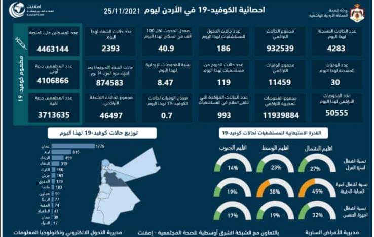 تسجيل 30 وفاة و 4283 اصابة جديدة بفيروس كورونا في الاردن أنباء الوطن - أعلنت وزارة الصحة الخميس، عن تسجيل 30 وفاة و4283 اصابة كورونا جديدة في الأردن.