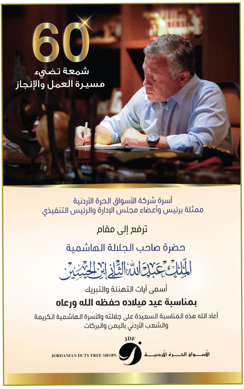 الأسواق الحرة الاردنية تهنئ جلالة الملك بعيد ميلاده الستين