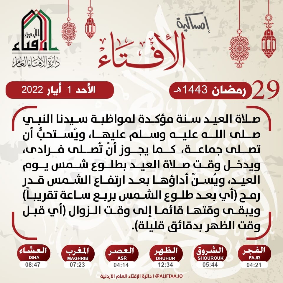 أنباء الوطن - اوضحت دائرة الإفتاء العام الحكم الشرعي لصلاة العيد.وبينت الافتاء في إمساكيتها لليوم التاسع والعشرين من شهر رمضان الأحد، الى أن صلاة العيد سنة مؤكدة لمواظبة سيدنا محمد صلى الله عليه وسلم عليها، كما يستحب أن تصلى صلاة العيد جماعة، ويجوز أن تصلى فرادى”.وأوضحت أن وقت صلاة العيد يدخل بطلوع شمس يوم العيد، ويسنّ أداؤها بعد ارتفاع الشمس قدر رمح (أي بعد طلوع الشمس بربع ساعة تقريبًا).واشارت الى أن وقت صلاة العيد يبقى قائمًا إلى وقت الزوال (أي قبل وقت الظهيرة بدقائق قليلة).