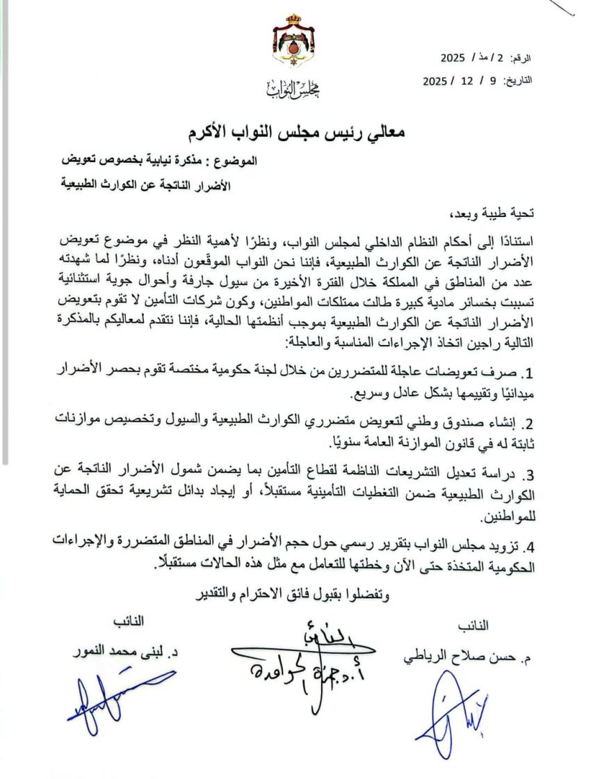 كما دعا النائبان إلى دراسة تعديل التشريعات الناظمة لقطاع التأمين بما يضمن شمول الأضرار الناتجة عن الكوارث الطبيعية ضمن التغطيات التأمينية المستقبلية، وإيجاد بدائل تشريعية تعزز الحماية للمواطنين.