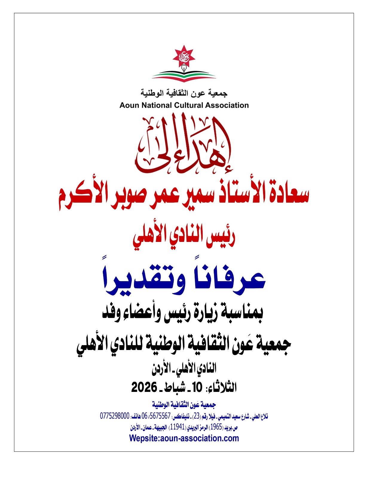 وختم صوبر حديثه بالتأكيد على رغبته بالتعاون مع جمعية عَون الثقافية الوطنية لأن أهداف النادي الأهلي تتقاطع مع أهداف الجمعية،وفي هذا فرصة قوية لتعزيز التعاون بيننا بما يخدم الوطن والقيادة والشعب الأردني.