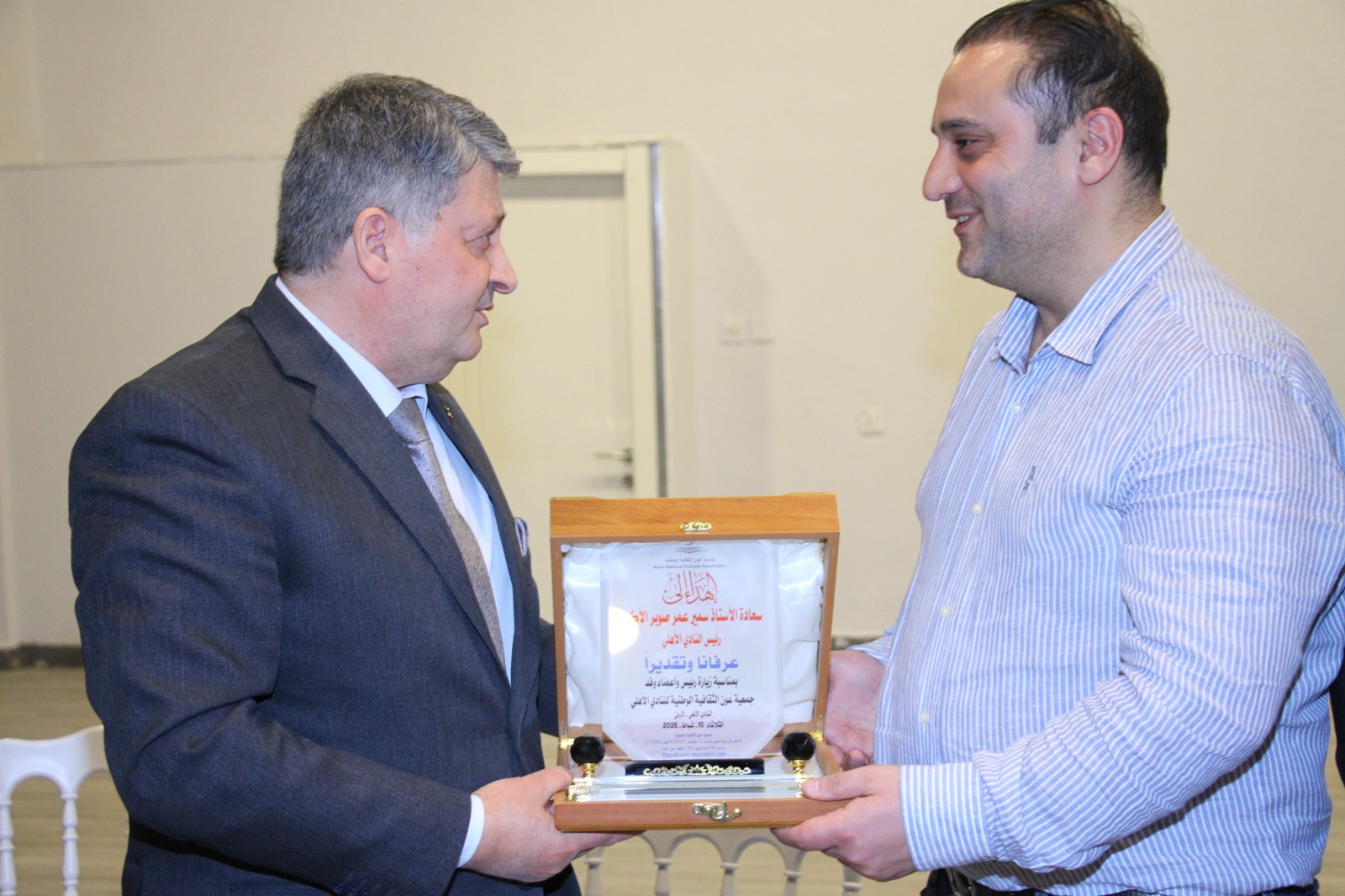 وقدم أسعد إبراهيم ناجي العزام رئيس الهيئة الإدارية لرئيس النادي الأهلي سمير عمر صوبر بمناسبة هذه الزيارة نسخة عن موسوعة تاريخ الأردن في القرن العشرين من عام 1900-1995 ونسخة أخرى عن كتاب (غربيون في بلاد العرب) إحدى مقتنيات مكتبة جمعية عَون الثقافية الوطنية (مكتبة المؤرخ سليمان الموسى) بالإضافة إلى درع الجمعية.