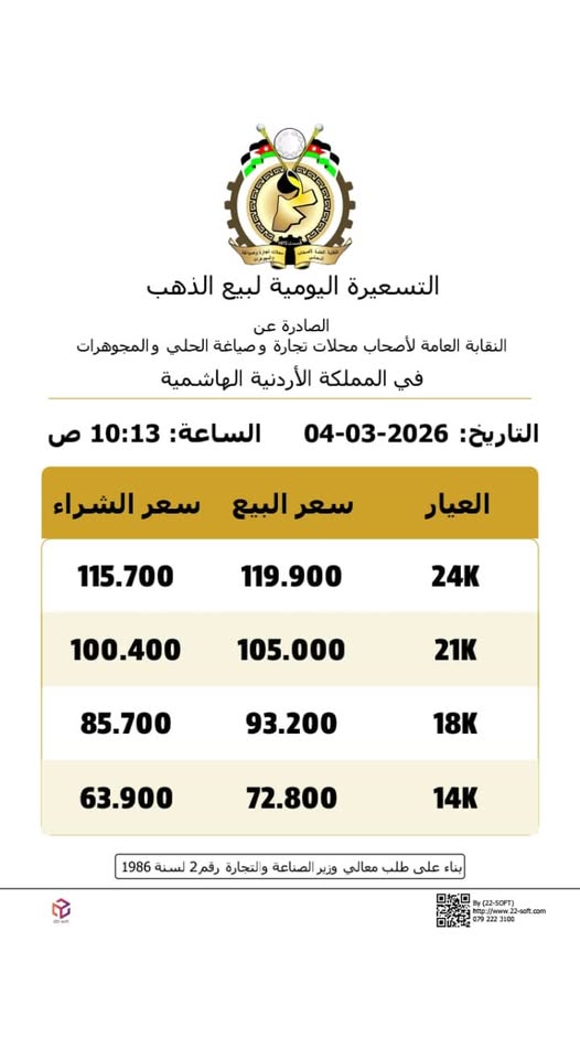 وبحسب النقابة العامة لأصحاب محالّ تجارة وصياغة الحلي والمجوهرات، بلغ سعر بيع الغرام الواحد من الذهب عيار 24 و 18 و14 على الترتيب، عند 119.9 دينارا و 93.20 دينارا و 72.80 دينارا على الترتيب