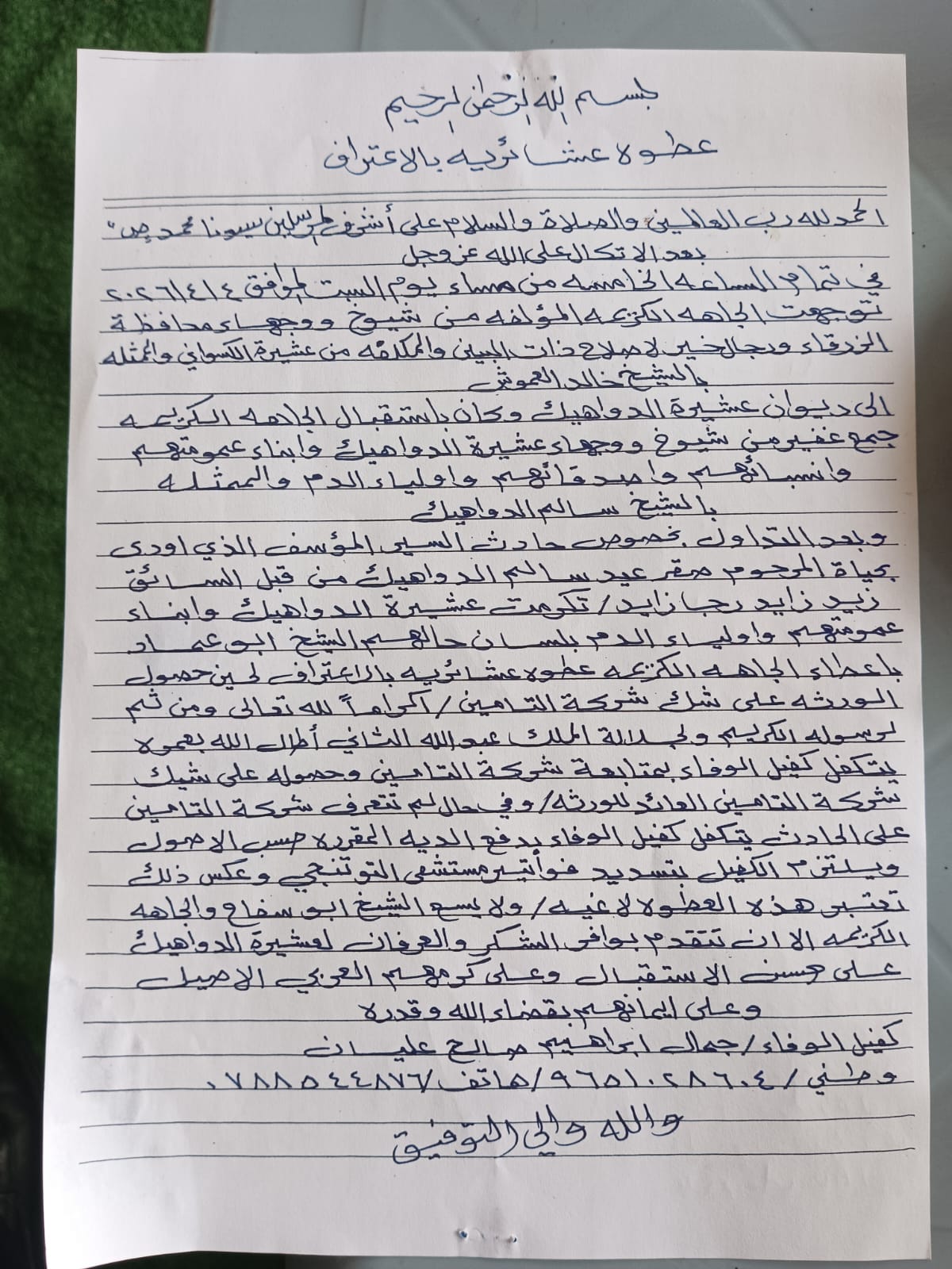 الشيخ خالد العموش ابو سفاح يترأس جاهة عشائرية لأخذ عطوة حادث سير اودى بحياة الشاب صقر عيد سالم الدواهيك رحمة الله