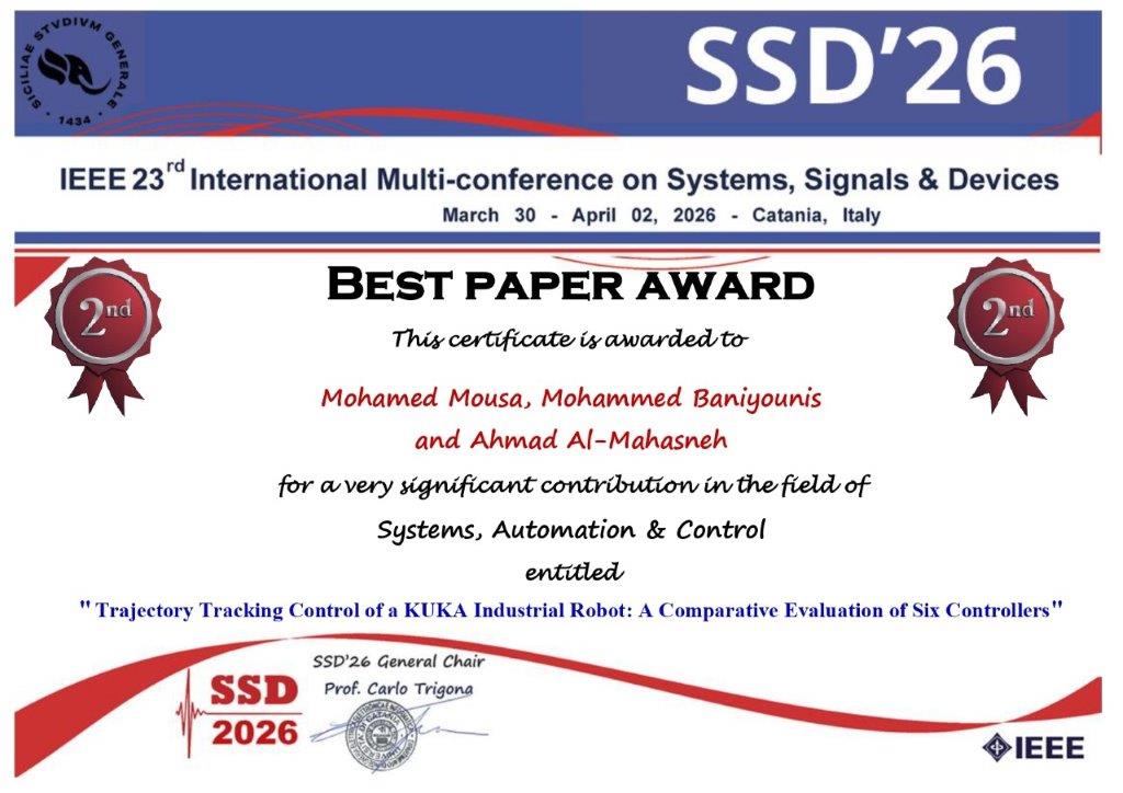 وذلك للباحثين: محمد بني يونس، وأحمد محاسنة، ومحمد موسى (وهو طالب سابق في برنامج ماجستير هندسة الميكاترونكس)، من بين (65) بحثًا مشاركًا في هذا المسار، بعد تقييمه وفق معايير علمية معتمدة شملت الأثر العلمي وجودة العرض.
