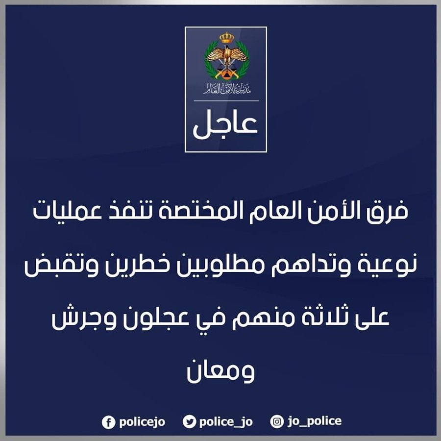 فرق الأمن العام المختصة تنفذ عمليات نوعية وتداهم مطلوبين خطرين وتقبض على ثلاثة منهم في عجلون وجرش ومعان