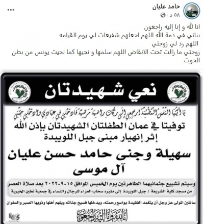 أردني ينعى طفلتيه وينتظر مصير زوجته باللويبدة