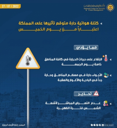 كتلة هوائية حارة تؤثر على الأردن حتى السبت