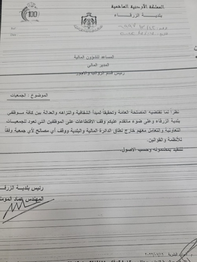 رئيس بلدية الزرقاء يوقف الاقتطاعات من رواتب الموظفين لصالح الجمعيات ومؤسسات الاقساط الربحية