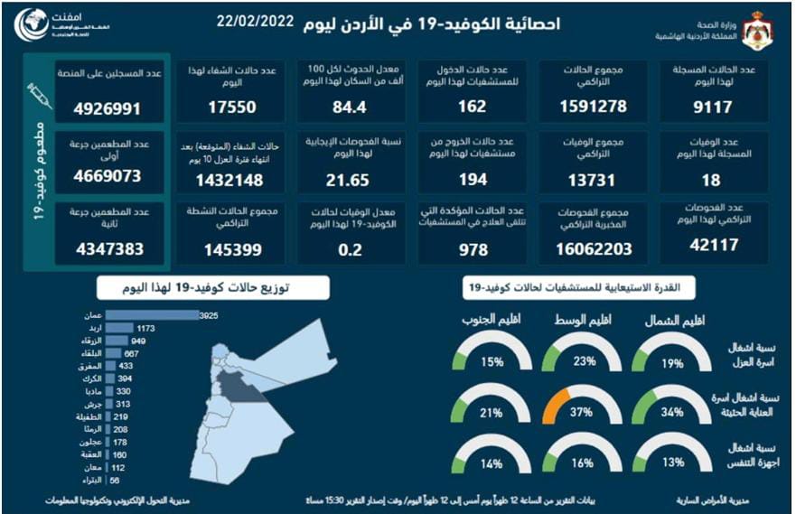 تسجيل 18 وفاة و9117 اصابة كورونا جديدة في الاردن