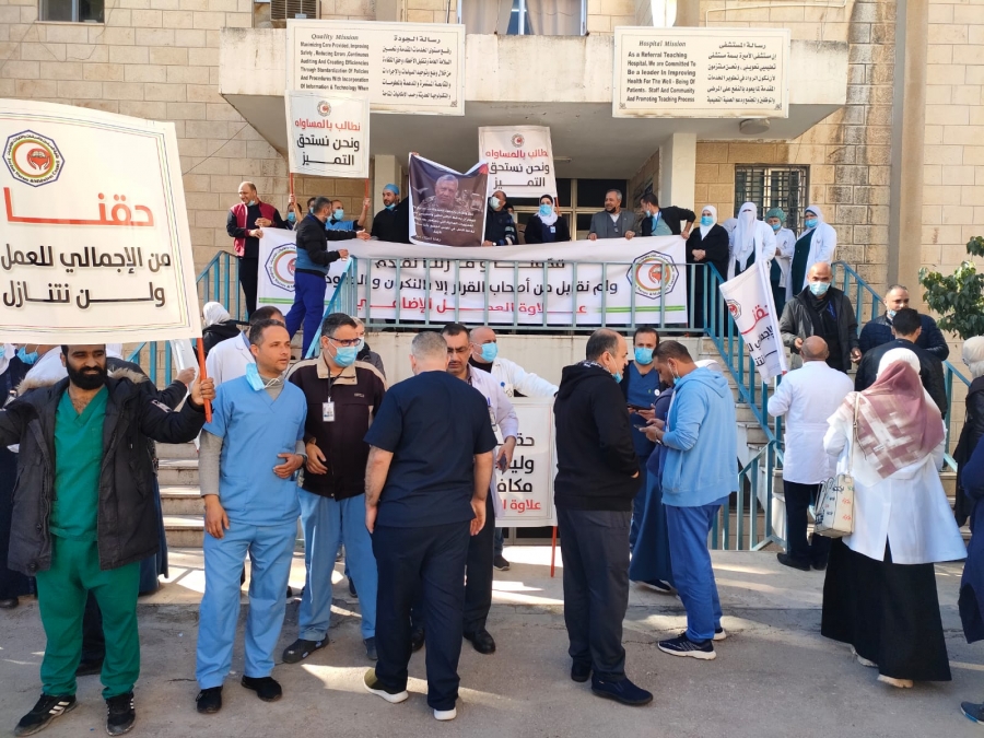 بالصور..وقفات احتجاجية للمطالبة برفع علاوة العمل الاضافي للمرضين في وزارة الصحة
