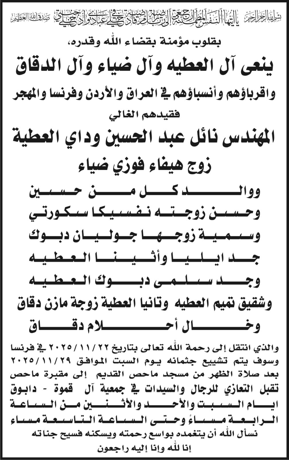 • المهندس نائل عبد الحسين وداي العطية في ذمة الله