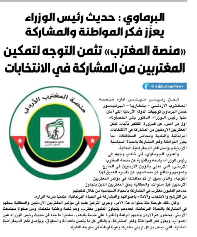 أنباء الوطن - ثمن رئيس مجلس ادارة منصة المغترب الاردني - بلغاريا - البرفيسور حسن البرماوي توجهات الدولة الأردنية التي اعلن عنها رئيس الوزراء الدكتور بشر الخصاونة، اول من امس، عن ضرورة التفكير بآليات تمكن المغتربين الاردنيين من المشاركة في الانتخابات البرلمانية والبلدية ومجالس المحافظات، بما يعزز المواطنة وفكر المشاركة بالحياة السياسية الاردنية ويؤصل لفكر الديمقراطية المثالية.