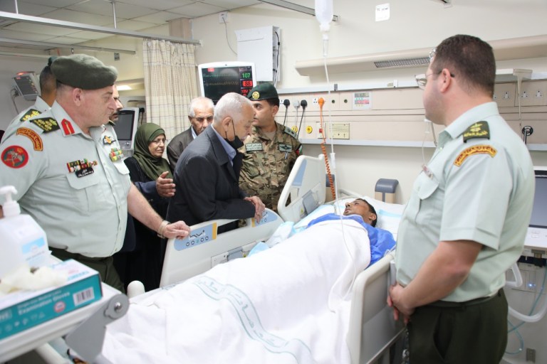 واستمع العيسوي، بحضور مدير عام الخدمات الطبية الملكية العميد الطبيب يوسف جمال زريقات، إلى شرح من رئيس اختصاص الجراحة العامة العميد الطبيب سمير الصمادي، عن الحالة العامة للمصابين الذين يستدعي علاجهم عدة أيام في المستشفى، حيث أنهم يعانون من حروق خفيفة في الوجه وجروح بسيطة في الساقين وحالتهم العامة جيدة.