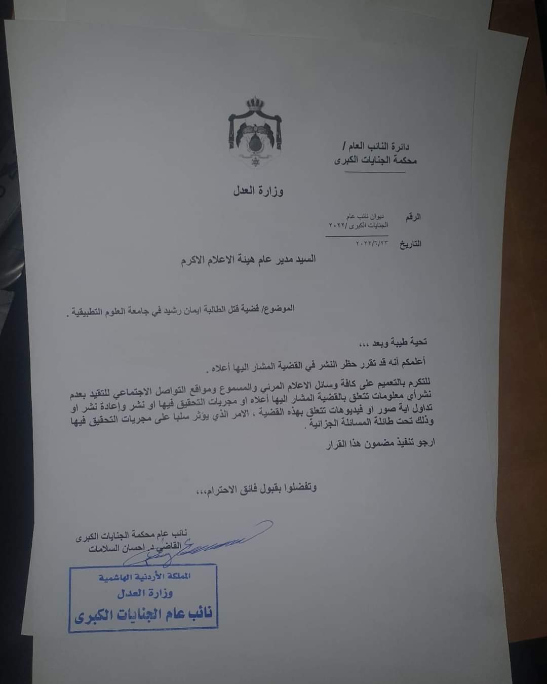 أنباء الوطن - قرر نائب عام محكمة الجنايات الكبرى القاضي د. إحسان السلامات ، حظر النشر بقضية مقتل الطالبة الجامعية ايمان ارشيد ، داخل جامعة العلوم التطبيقية اليوم الخميس .