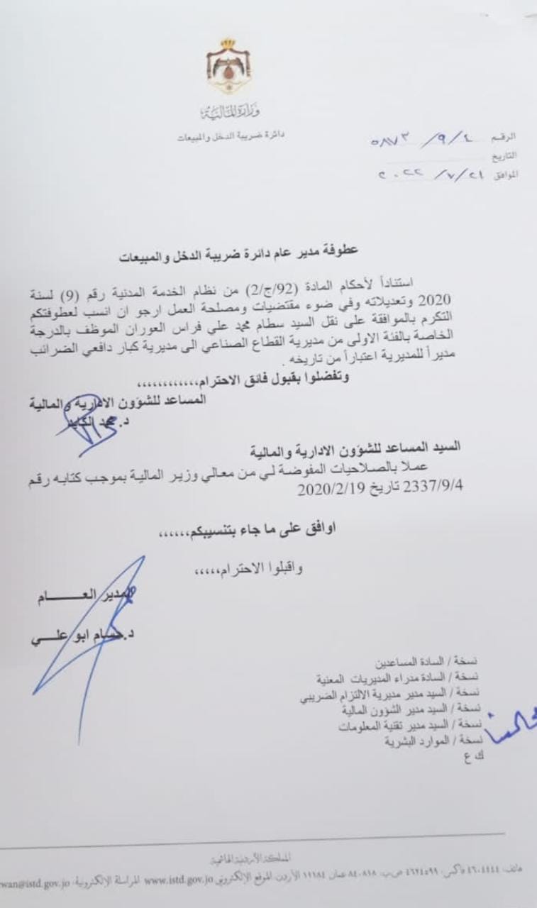 أنباء الوطن - قرر مدير عام دائرة ضريبة الدخل والمبيعات حسام أبو علي وبناء على تنسيب المساعد للشؤون الادارية والمالية الموافقة على نقل السيد سطام محمد العوران مديرا لمديرية كبار دافعي الضرائب
