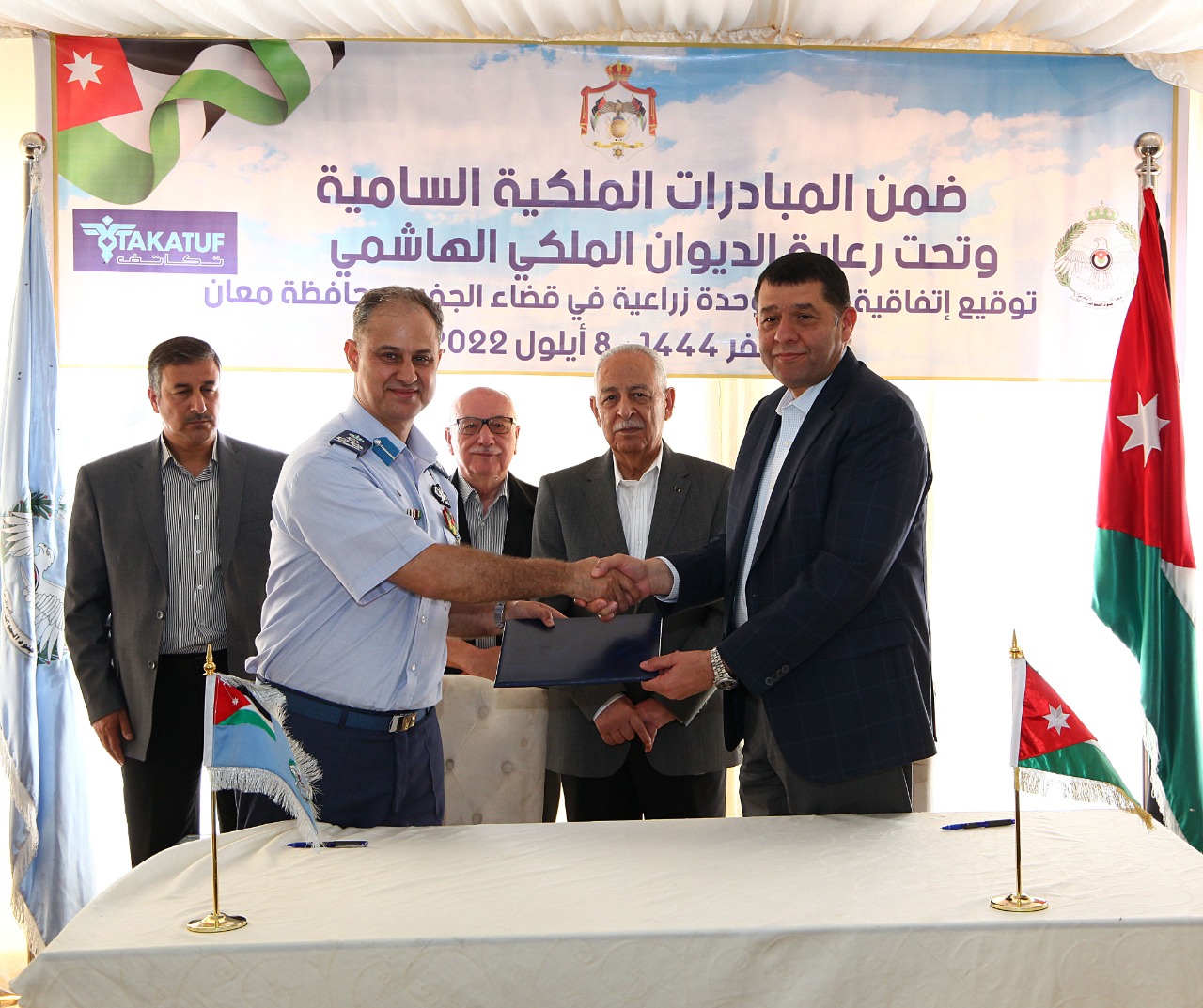 من جهته، قال العميد الركن الطيار حياصات إن اتفاقية إنشاء مشاريع إنتاجية، ضمن المبادرات الملكية، لتدريب وتشغيل بنات وأبناء منطقة الجفر والمناطق المحيطة، والتي ستنفذها شركة تكاتف للاستثمارات الزراعية والصناعية بالشراكة مع قيادة سلاح الجو الملكي، وشركات القطاع الخاص، تلبي مطالب أهالي المنطقة، وتشمل مشاريع استزراع الثروة السمكية والنباتية، التي ستوفر فرص العمل، وتسهم في تنمية وتطوير المنطقة.
