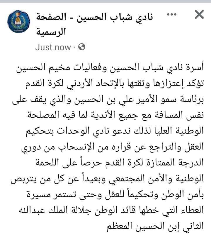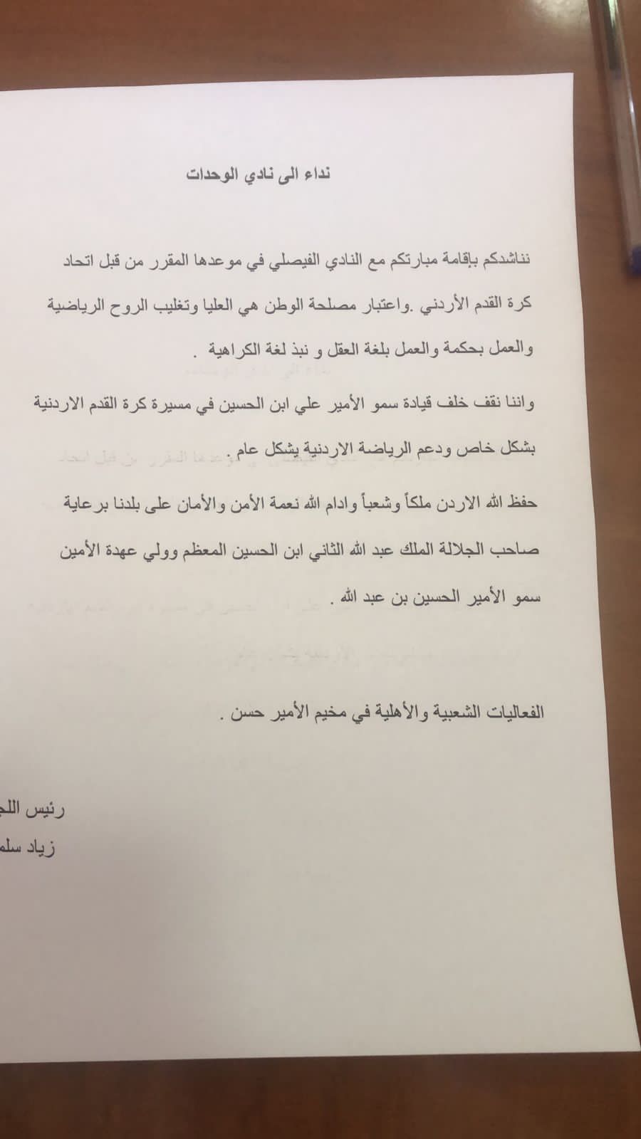 نناشد ادارة نادي الوحدات بالعدول عن قرار الانسحاب بسبب تداعيات قرار الاتحاد نقل مباراة (الوحدات والفيصلي) ضمن الأسبوع الـ21 من الدوري الأردني للمحترفين، إلى ستاد الحسن في إربد، بدلاً من ستاد الملك عبدالله الثاني وذلك للاسباب التالية :