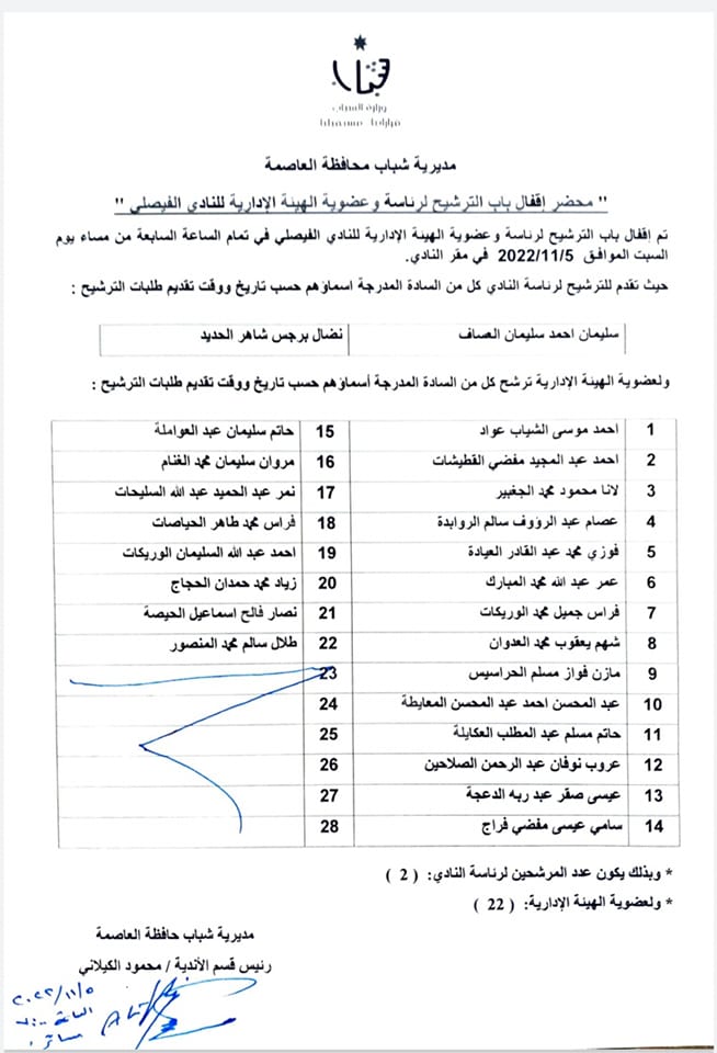 العساف والحديد يتنافسان على رئاسة الفيصلي و22 مرشحا للعضوية