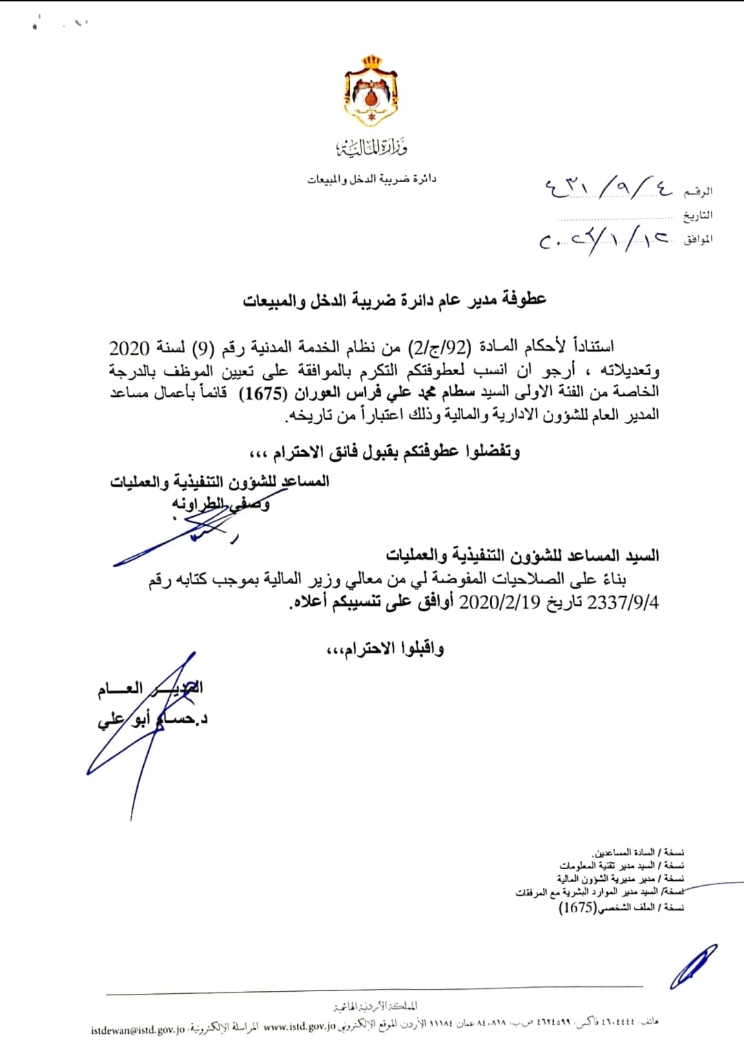 سطام العوران مساعدا للمدير العام للشؤون الادارية والمالية في ضريبة الدخل