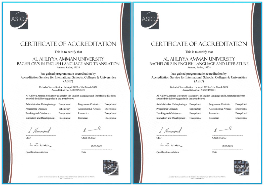 أنباء الوطن - حققت كلية الآداب والعلوم - قسم اللغة الانجليزية في جامعة عمان الأهلية إنجازاً أكاديمياً رفيعاً بحصول برنامجي بكالوريوس اللغة الإنجليزية وآدابها واللغة الإنجليزية والترجمة على الاعتماد البريطاني ASIC وفق أعلى مستوى ضمن فئة التميّز " المستوى الاستثنائي".
